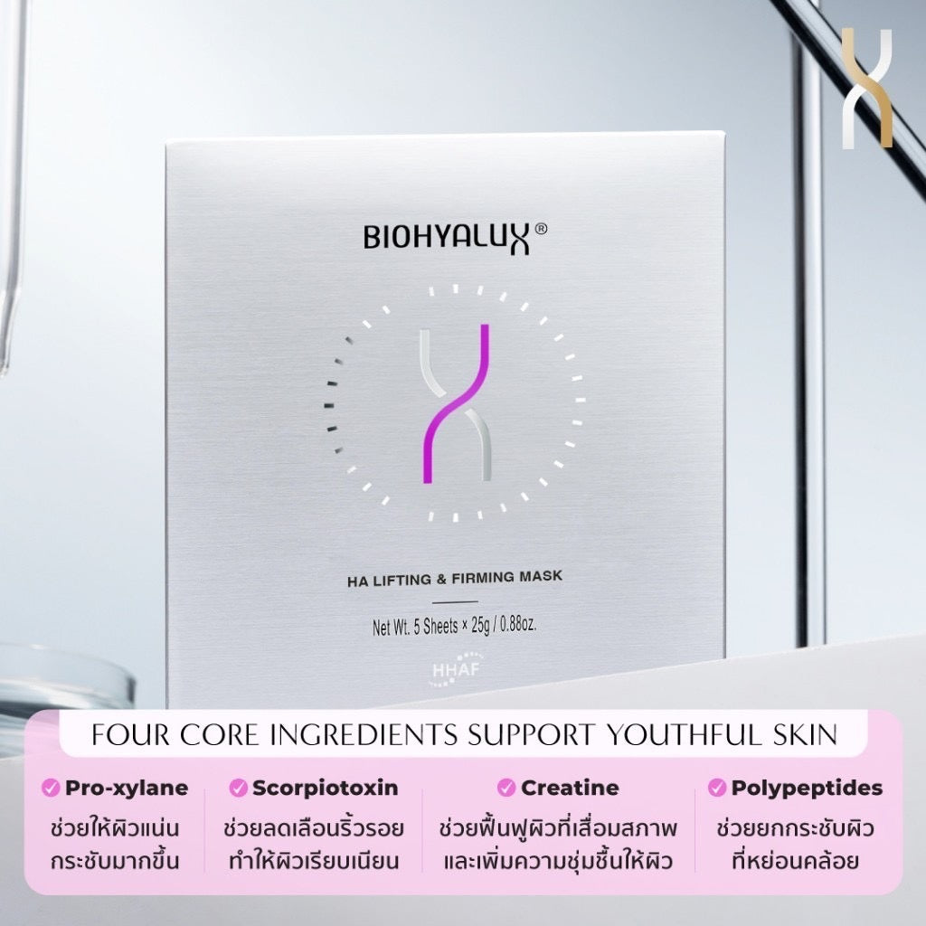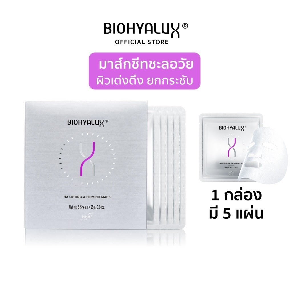 1. Biohyalux Lifting and Firming Mask ไบโอยาลักซ์ มาส์กยกกระชับผิว ชะลอวัย มาส์กชีทสูตรช่วยยกกระชับผิว อุดมด้วย 4 ส่วนผสม Pro-xylane, Creatine, Scorpiotoxin และ Polypeptides สารสุดยอดแห่งการชะลอวัย รวมทั้งยังมี Centella Asiatica Extract ช่วยลดการระคายเคือง และปลอบประโลมผิว และยังมี Ginseng Extract ช่วยต่อต้านอนุมูลอิสระ เผยผิวกระจ่างใส