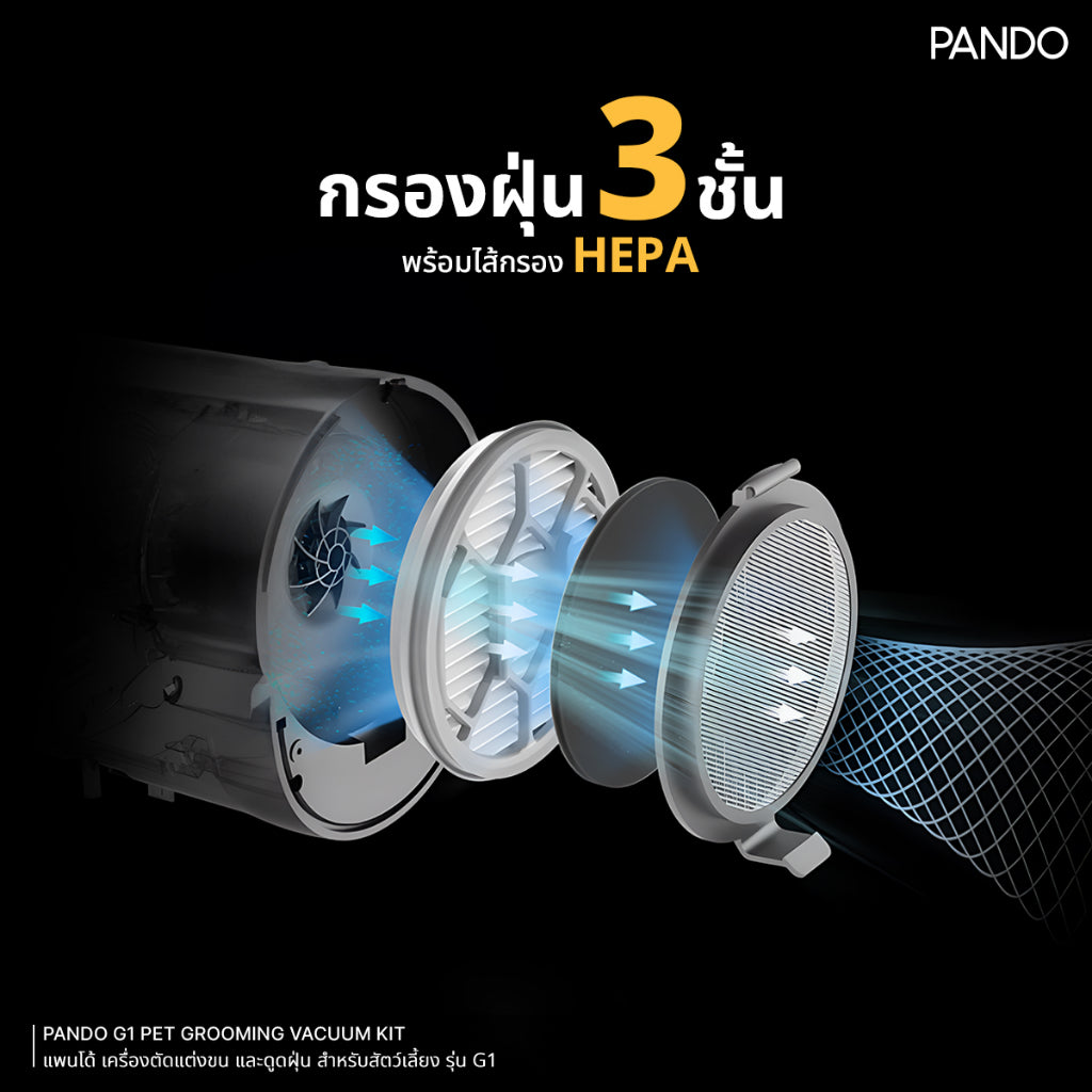 • นวัตกรรมกรองฝุ่น 3 ชั้น (ตาข่าย/ฟองน้ำ/ไส้กรองHEPA)