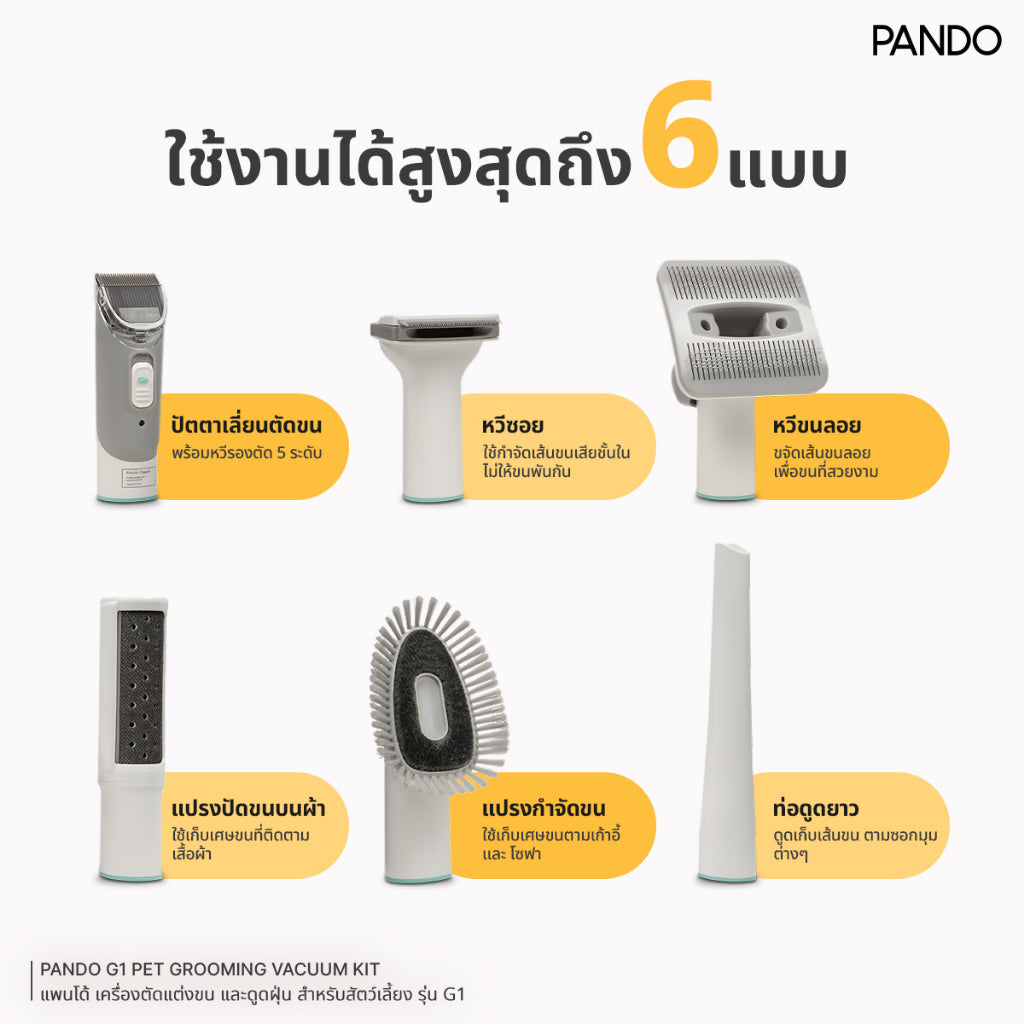 • มีหัวเปลี่ยนถึง 6 แบบ (แปรงปัดขนบนผ้า/ หวีซอย/ หวีกรูมมิ่ง / ปัตตาเลี่ยนตัดขน / แปรงกำจัดขน / ท่อดูดยาว)